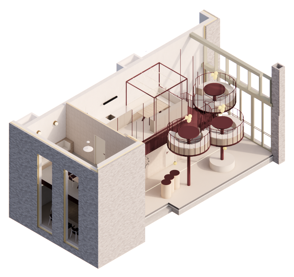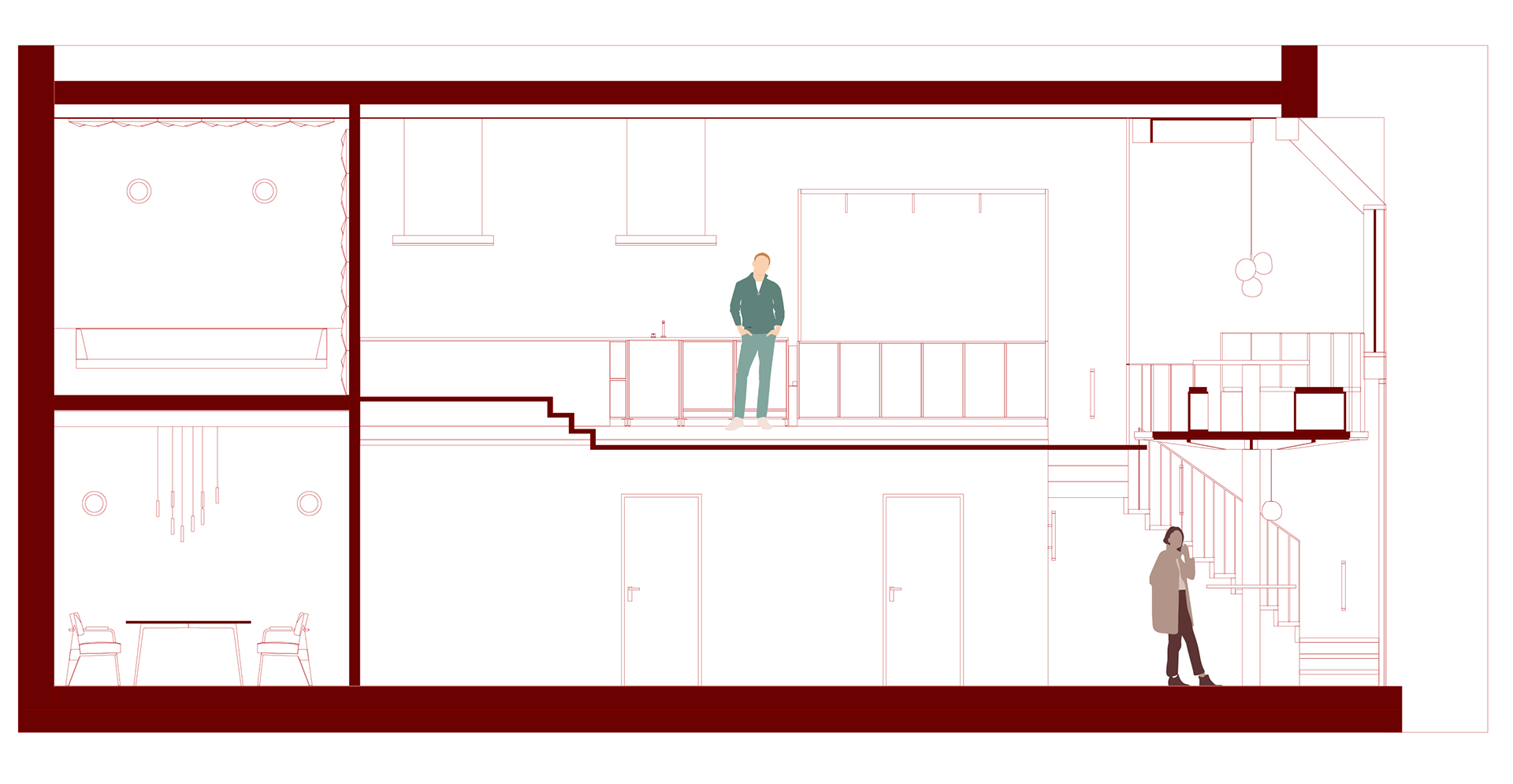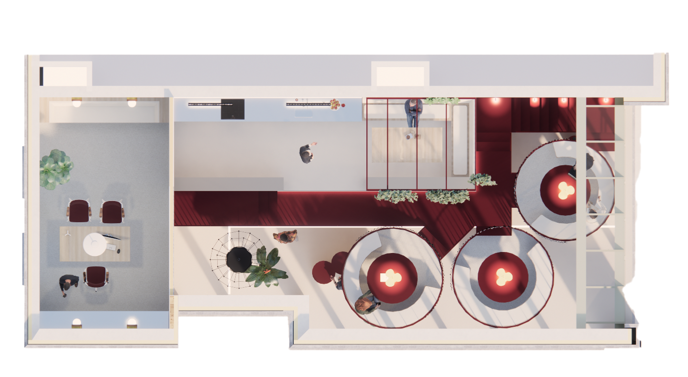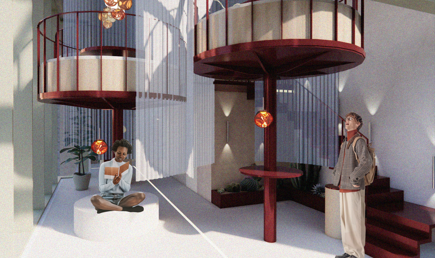 L’escalier en métal monumental relie les différents espaces et guide intuitivement les visiteurs, comme s’ils entamaient déjà une expédition avant même que le voyage ne commence.